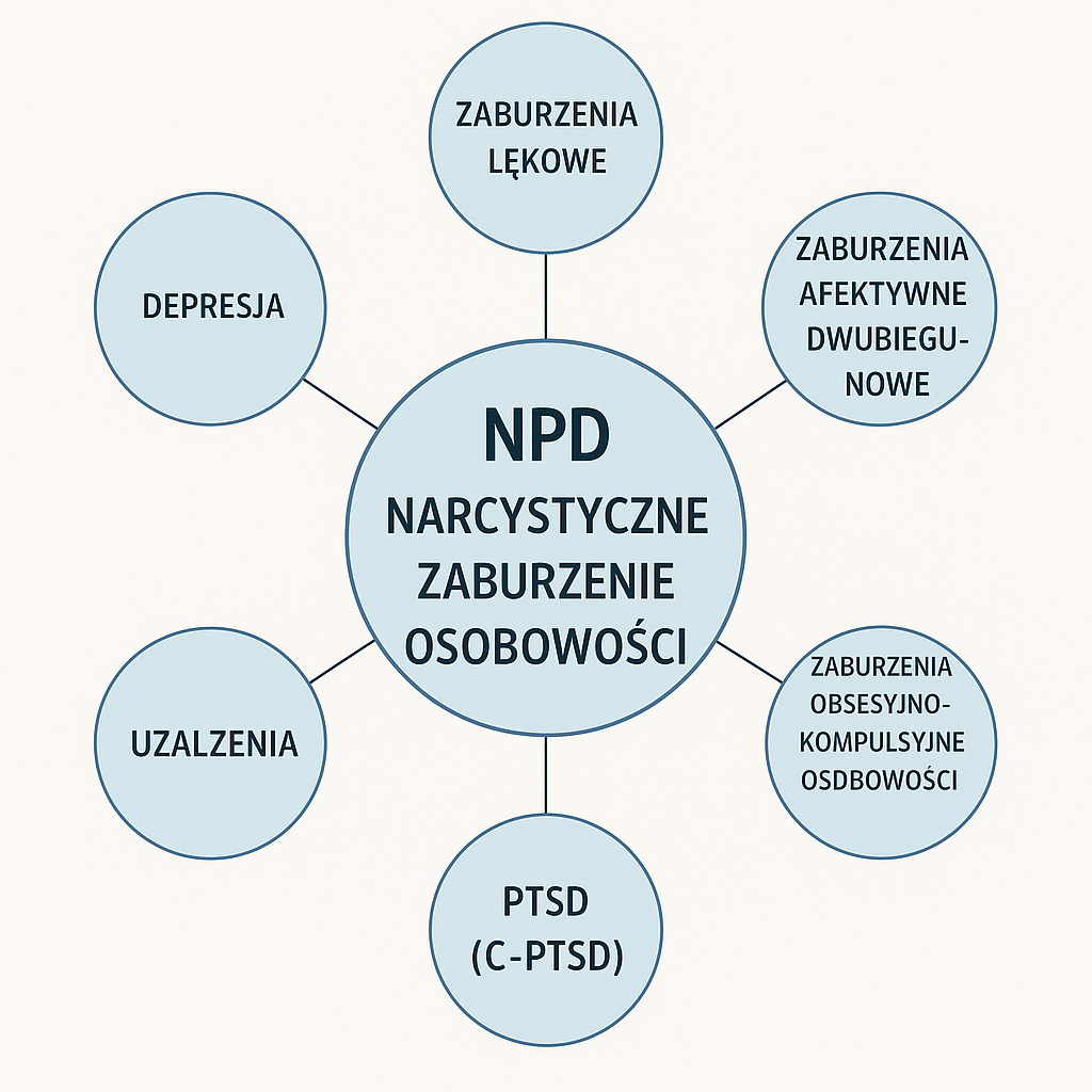 Narcystyczne zaburzenie osobowości (NPD) rzadko występuje w izolacji. Bardzo często towarzyszą mu inne zaburzenia psychiczne — niektóre są „ukryte”, inne przybierają bardziej widoczne formy. Taka współwystępowalność nosi nazwę komorbidności.